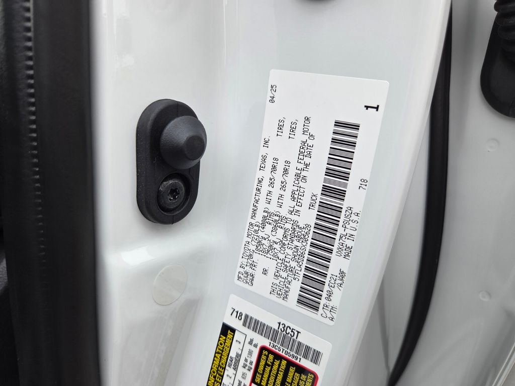 Equipped with SR5 Convenience Package (122L Fuel Tank, Blind Spot Monitor w/Lane Change Assist, and Parking Support Alert/Brake), SR5 Premium Package (8-Way Power-Adjustable Heated Front Seats, Automatic Power Tailgate with Easy Closing, and SofTex Seat Trim), 18" Alloy Wheels, 3.31 Axle Ratio, 4-Wheel Disc Brakes, 9 Speakers, ABS brakes, Air Conditioning, Alloy wheels, AM/FM radio: SiriusXM, Apple CarPlay/Android Auto, Auto High-beam Headlights, Automatic temperature control, Brake assist, Bumpers: body-color, Delay-off headlights, Driver door bin, Driver vanity mirror, Dual front impact airbags, Dual front side impact airbags, Electronic Stability Control, Emergency communication system: Safety Connect (10-year trial), Exterior Parking Camera Rear, Fabric Seat Trim (FB), Front anti-roll bar, Front Bucket Seats, Front Center Armrest, Front fog lights, Front reading lights, Front wheel independent suspension, Fully automatic headlights, Heated door mirrors, Illuminated entry, Knee airbag, Low tire pressure warning, Occupant sensing airbag, Outside temperature display, Overhead airbag, Overhead console, Panic alarm, Passenger door bin, Passenger vanity mirror, Power door mirrors, Power driver seat, Power steering, Power windows, Radio data system, Radio: Audio Multimedia System, Rear reading lights, Rear step bumper, Rear window defroster, Remote keyless entry, Safety Connect, Security system, Speed control, Speed-sensing steering, Split folding rear seat, Steering wheel mounted audio controls, Tachometer, Telescoping steering wheel, Tilt steering wheel, Traction control, Trip computer, Variably intermittent wipers, and Voltmeter.